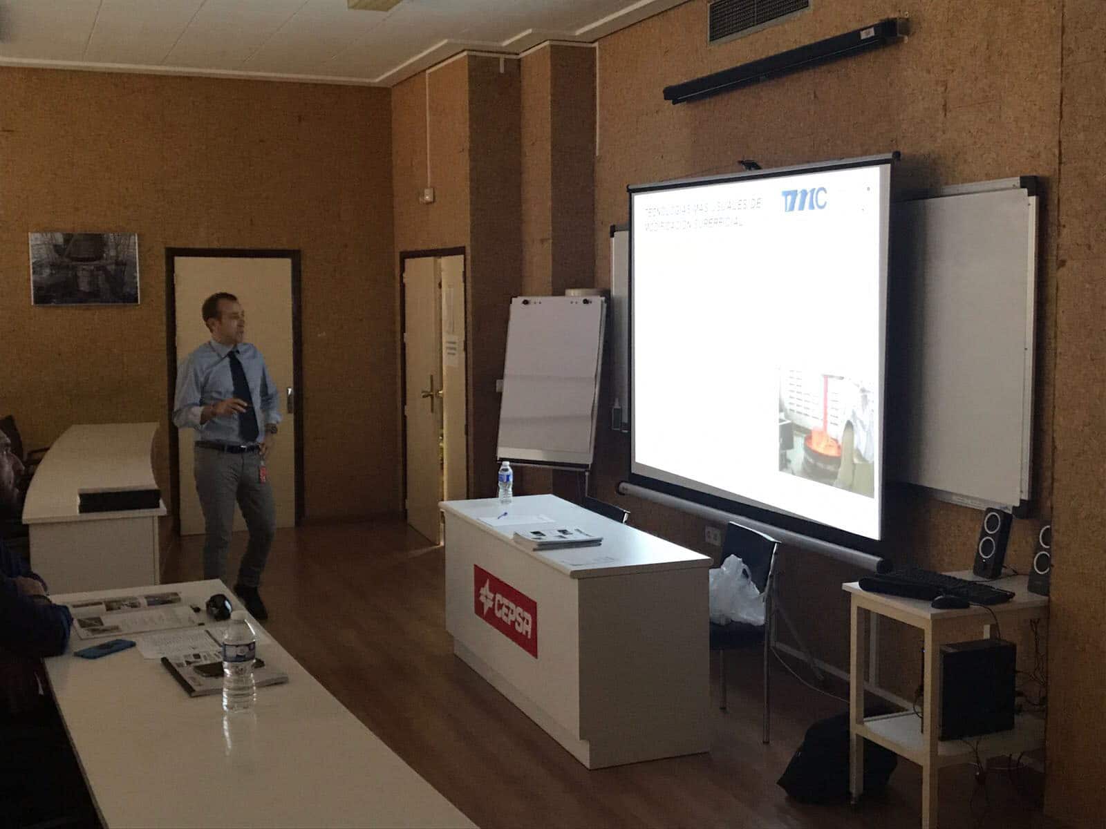 Durante la sesión, el Director Técnico de TMCOMAS habló de las aplicaciones para refinerías que tienen los servicios que ofrecemos. Concretamente, expuso temas técnicos relacionados con las tecnologías de superficie, de proyección térmica, de laser cladding y de cojinetes antifricción, aplicándolos a los casos prácticos con los que se trabaja a diario en la planta de CEPSA situada en Algeciras.